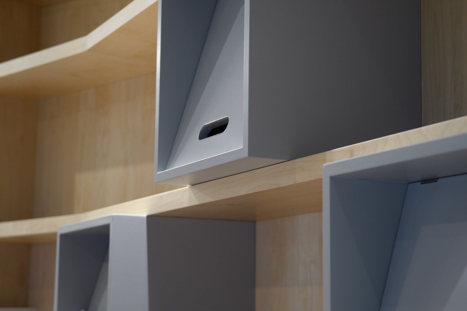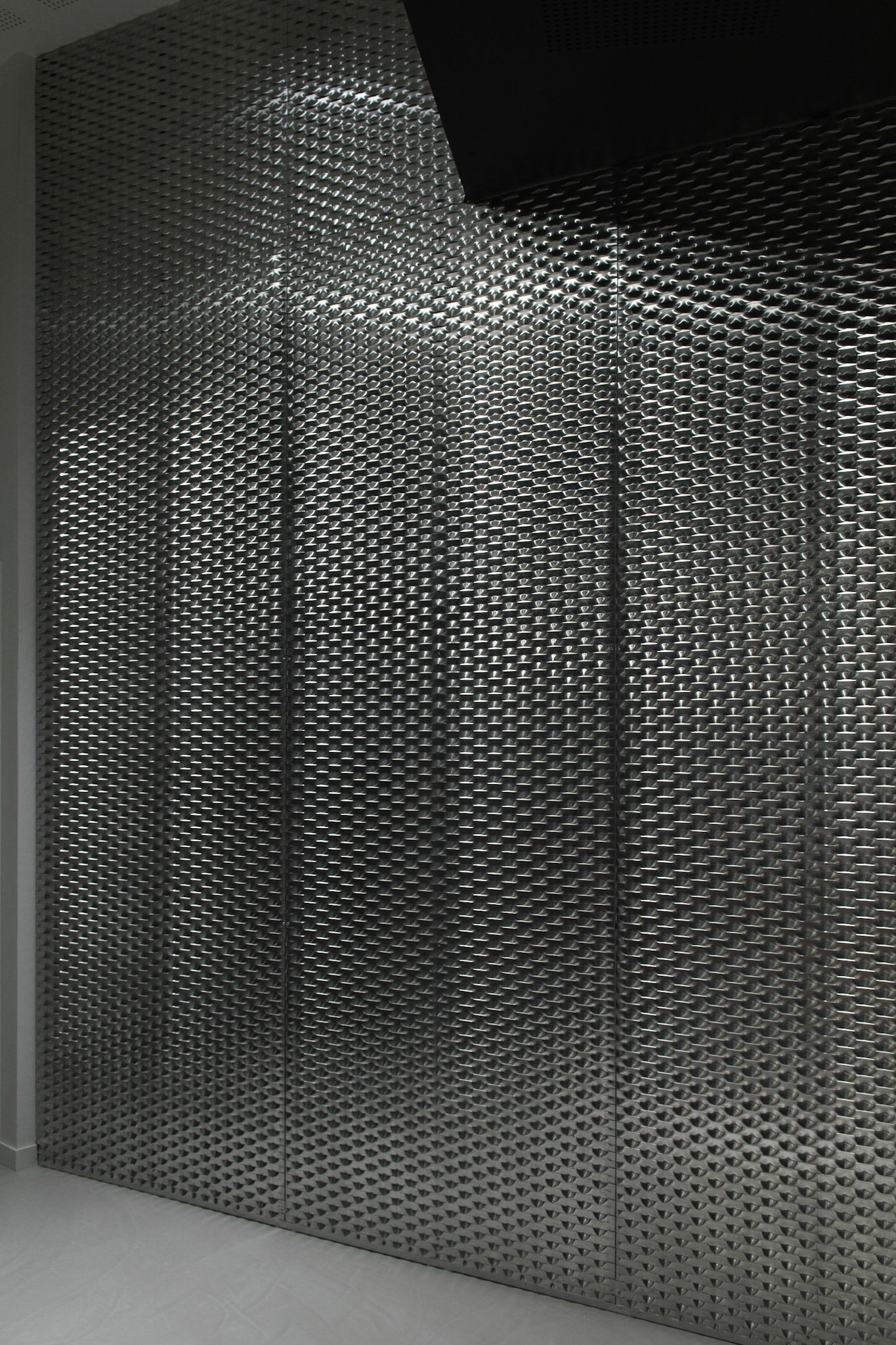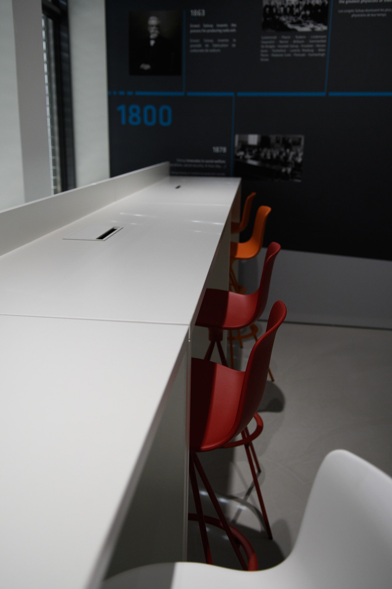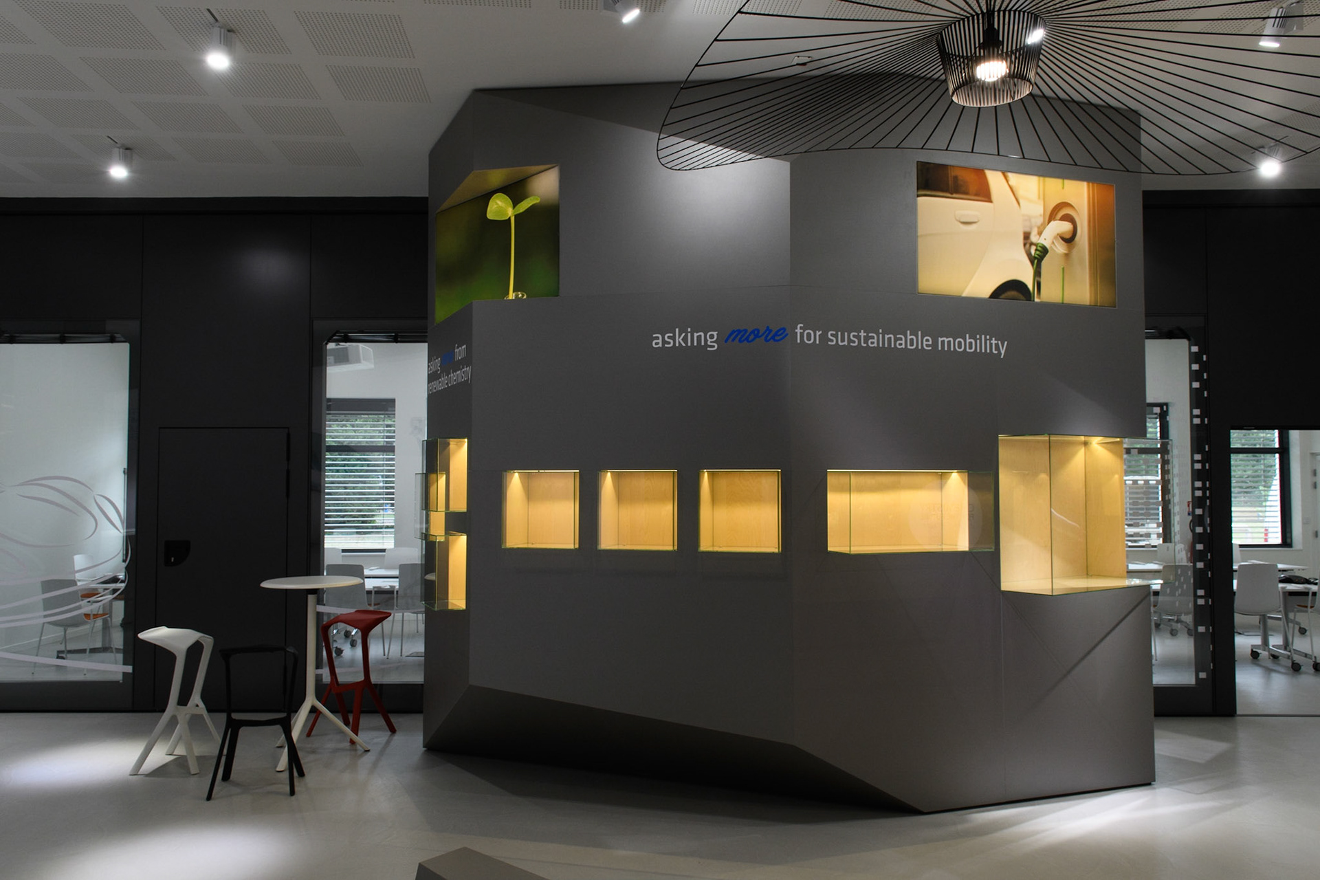 particularités projet . agencements menuisés polyédriques, vitrines, murs mobiles sous charpente métallique, béton ciré, intégration CVC à l'existant, intégration multimédia