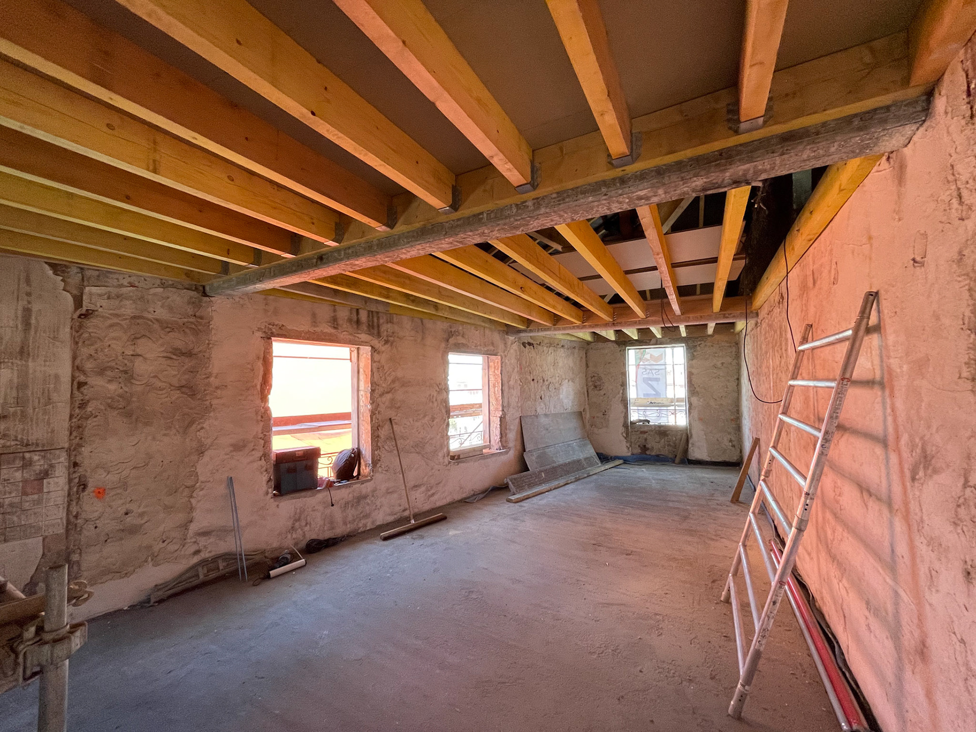 particularités projet . murs anciens hétérogènes (pierres, pisé, mâchefer, briques), bardage et terrasses en bois régional, enduits chaux, reconstitution de verrière et fenêtres avec verre coloré de la Verrerie de Saint-Just, reconstitution de corniche bois, couverture tuile et aluminium, micro-parc, chauffe-thermodynamiques couplés à la VMC, membrane pare-vapeur et d'étanchéité à l'air hygrovariable
